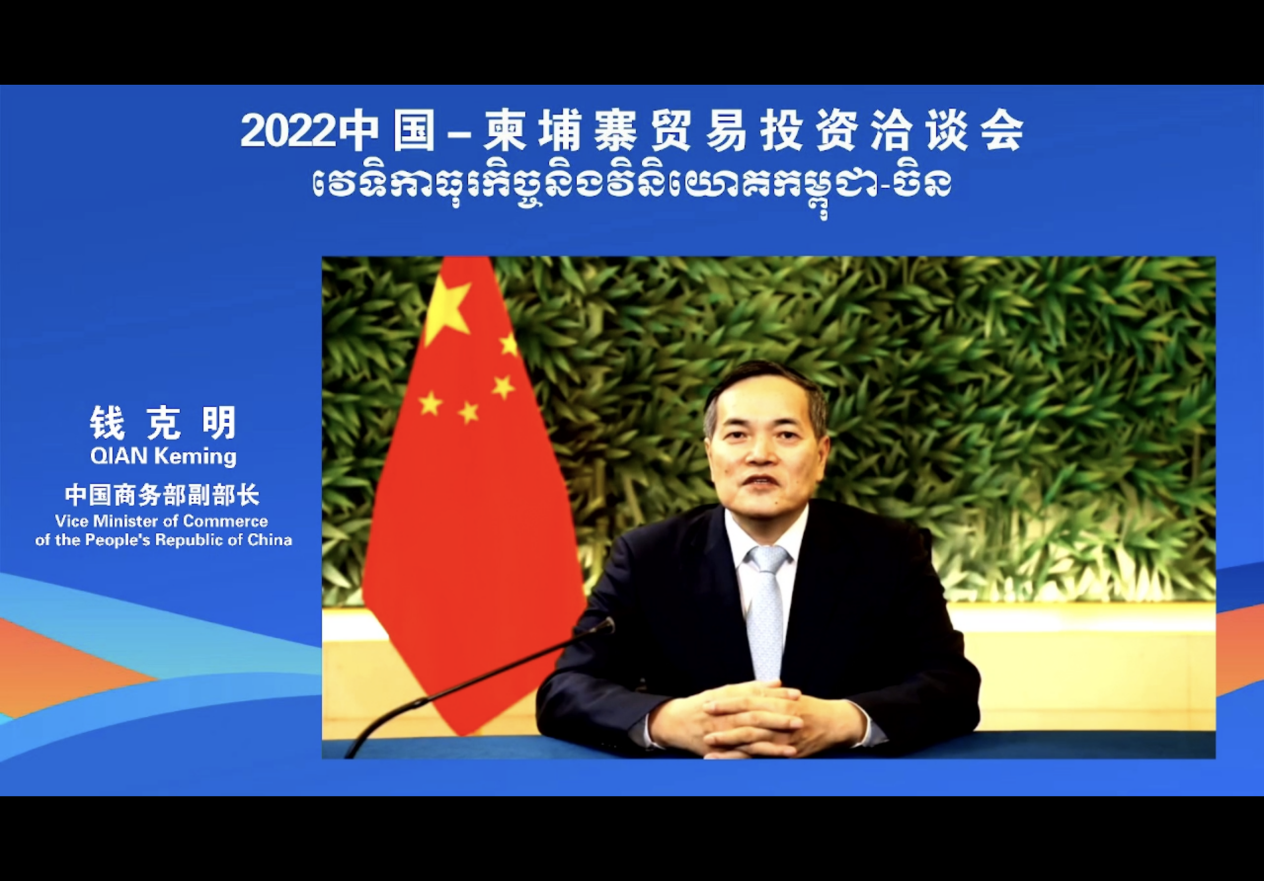 5月18日,商务部副部长钱克明在2022中国—柬埔寨贸易投资洽谈会上发表视频致辞。柬埔寨商业部国务秘书森泰出席并致辞。2022中国—柬埔寨贸易投资洽谈会由商务部、中国驻柬埔寨大使馆、柬埔...